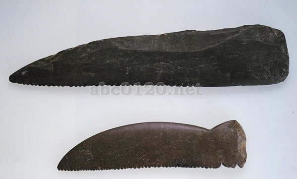 石灰岩で周到な磨製.1点は背が彎曲し,刃部は真直で細かな鋸状の歯があり,柄は幅が広く,後部はややそり上がり、下部には欠けた個所がある。別の1点は背がわずかに彎曲し,刃部は真直で, これにも細かな鋸状の歯があり,柄は長方形を呈する。出所:「黄河文明展」