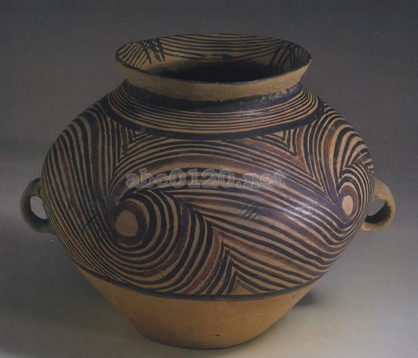 泥質。口縁部の端の断面は尖っている。口縁は広がり,頸部はくびれている。鼓腹,平底.腹部下よりに対称の耳一対がある.黒彩, 紅彩2色を施し, 口縁の内側には並行する弧線文とその間に短線を配する.頸部には2本の黒色の,太い線の間に細い線が描かれている.腹の上部には黒線と紅線で4組の連続した渦巻文が描かれている.こうした連続する渦巻文は原始社会の人々が黄河の激流を表現しているかのようである。出所:「黄河文明展」