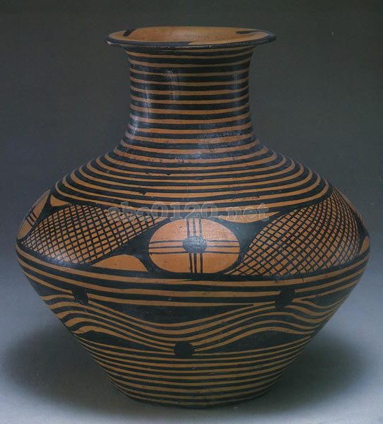 口縁は外側に折れ,先端はわずかに巻く.長頸,なで肩,平底 橙色の上に黒彩.口部に変形葉文が飾られ,頭部と肩部に弦文がある。主体の文様は腹部の弦文三条の上と下にある.上部は,円形・弧線三角・円点・網文から成る4組の図案が連続し,円形内に3本線の十字文がつけられている.下部には波文と円点文があしらわれている。下腹部にも弦文がある.磨きは精緻で,全体に彩色が施され,文節は均整がとれ,色彩は鮮やかである。出所:「黄河文明展」