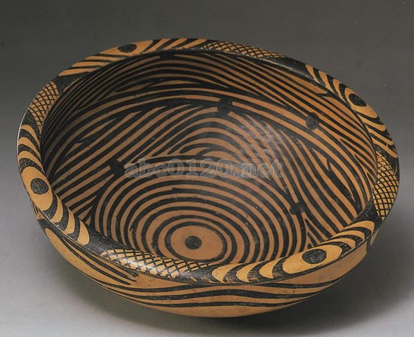 すぼんだ口, 口縁部の先は巻く.小平底.橙色の上に内外面に黒彩を施す。口縁は複雑に装飾され, 弧線三角・勾葉・円点・網文が施される。内部は全面に同心円と円点・波文,外腹に風に舞う細い布の如き文様を飾る.よく磨かれて全面に光沢があり,文様は流れるように淀みなくあでやかである。出所:「黄河文明展」