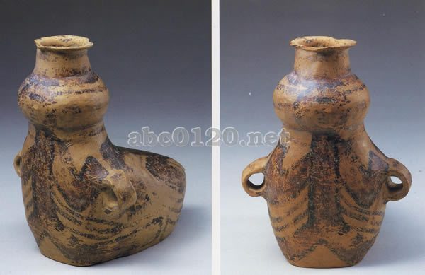 器身は鴨形.双耳。頭部はひょうたん形の頸で鴨の頭に似る。黒彩と紅彩.背と腹に鴨形の文様が描かれ,すき間は波文で填められている.鴨が頭をもたげて鳴きながら泳ぐ姿を写している。出所:「黄河文明展」