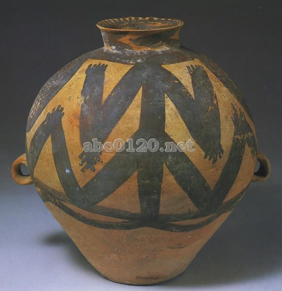 口縁部先端は僅かに外反する.短頭・鼓腹・双耳・平底.褐彩を施す。口縁の内側に縦線文が,腹の上部両側に変形蛙文がある.蛙の間に対称に円形各一があり,その中は網文で填められている。出所:「黄河文明展」