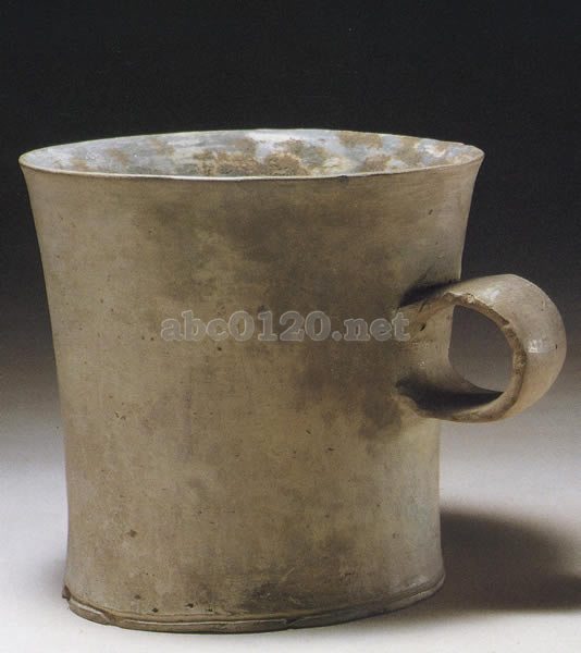 泥泥質白陶。口縁部の端の断面は尖っている 直壁.全体が筒形を呈する.環形の取っ手.底近くに弦文が1本刻まれている.器壁はむらなく薄く,無文で磨かれ,陶色は清白である。出所:「黄河文明展」