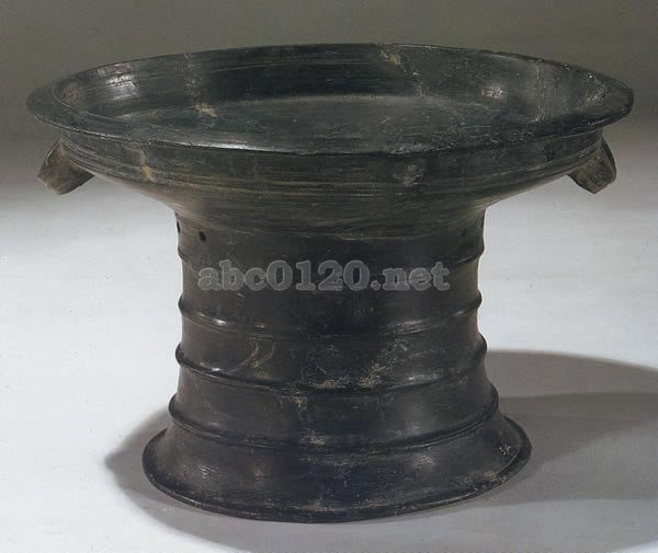 泥質黒陶.口縁部先端の断面は丸く,外に折れている.直壁.盤は浅く,外壁に沈線を2本施し,橋形の耳が対称につけられる。高い圏足に4筋の突帯があり,上部に一対の小孔が9組あけられている。出所:「黄河文明展」