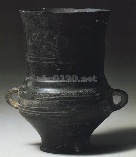 細泥黒陶.器形は高く, 口縁部は幾らか開き,頸部は長い.腹部は丸味があり,底は平らに近い 頭部と腹部に数本の弦文があり,腹部に対称の耳がある。出所:「黄河文明展」