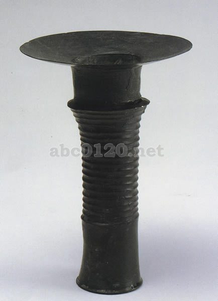 細泥黒陶.器身と器座を別々に轆轤成形してから組み合わせてある.器壁は極めて薄く,わずか0.5ミリ,表面は精緻で光沢がある.口縁部が大きく開いた丸底直壁の杯が,細く高い円筒状の器台の中にはめ込まれている 器台は腰がややしまり,中部以上に幾筋もの突帯が施されている。出所:「黄河文明展」