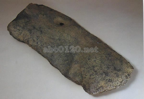 (儀礼用の打楽器) 新石器時代(龍山文化 後期) 長81cm幅31cm 1980年山西省聞喜県出土 山西省聞喜県博物館蔵 石英.打製.長方形.一方の側はやや彎曲し,上部の片側寄りに縄をかけて吊す円い孔がある。これは両面から磨いてあけたもの.石磐の音は美しい。出所:「黄河文明展」