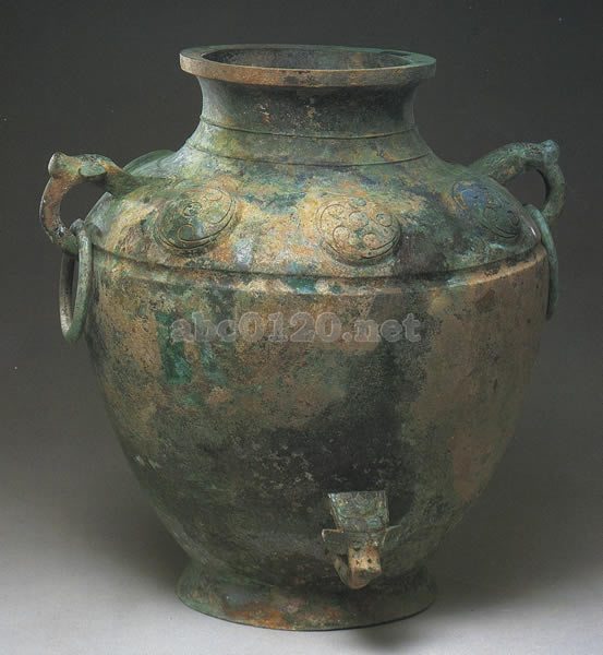 小さな日はやや広がる。幅広い肩.腹はしまり圏台が付く.頸に弦文を飾る.肩に大きな円渦文を飾り,対称的に龍首の耳がある.腹の下部に獣首の付いた鐶がある。出所:「黄河文明展」
