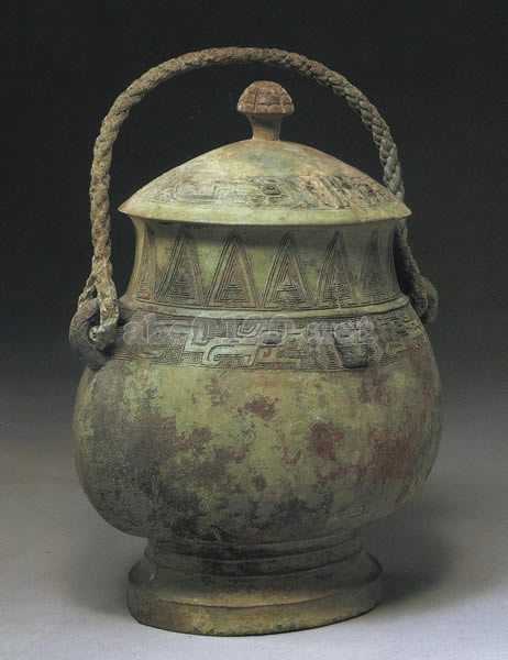 茸状の鈕(つまみ).頭の下の方に一対の環形の耳があり,縄形の吊り手と連なる。腹部は下ぶくれで断面は杏仁形.圏足がある。蓋と腹上部に2つの夔文.頭部に蕉葉文,腹上部の中央に獣頭を飾る。出所:「黄河文明展」