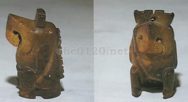 濃い褐色.黒い斑がある。丸彫り.首を上げて立つ様.三角形の顔,大きな両眼.耳に似た突起はつながっていて,中央に小孔がある。鉤になった大きな嘴は胸まで曲がり,両翼を合わせ,背に稜飾がある 広い尾を垂らし,両足はたくましく,腹と翼に羽根文を飾る。出所:「黄河文明展」