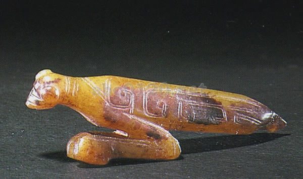 薄緑色.褐色の斑がある.丸彫り。体は細長く,頭を右に傾けている。尖った口は少し開き,円い眼は突起し,両翼を合わせ,鎌状の脚は前屈する.脚の下に小さな構があり,両脚の間に小孔がある。造形が巧みで,意匠を凝らしている。出所:「黄河文明展」