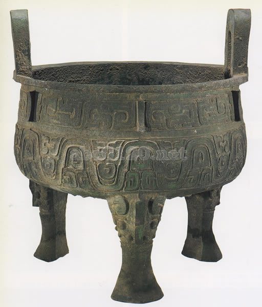 口縁は外に折れ,先端は角張っている。口は僅かにすぼむ.ほぼ垂直の腹,獣形足.口縁の上に直立した耳.耳の外側には向い合った龍があり,足の上部には「饕餮文」がある.腹の上部に6個の稜飾があり,その間に窃曲文を飾る.腹部の主文様は環帯文である。出所:「黄河文明展」