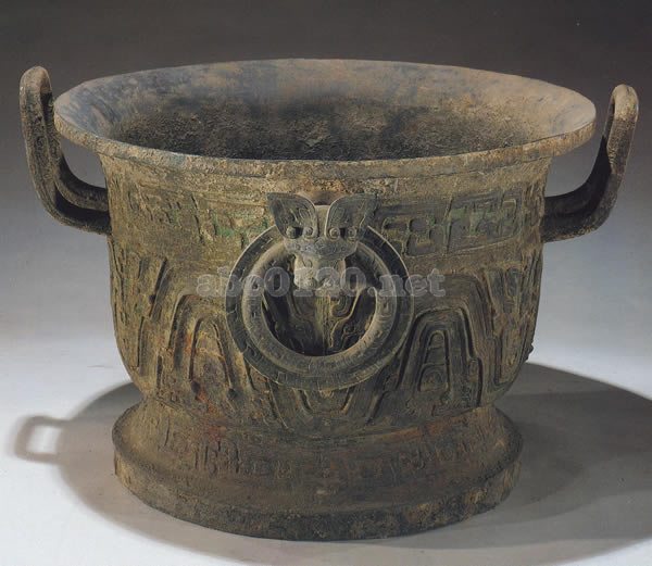 張り出した口,垂直に立ち上がった腹部。一対の耳は器口より高く出る.もう一対は環のついた獣首である.頸と圏足に窃曲文,腹に環帯文と変形夔文とがある。出所:「黄河文明展」
