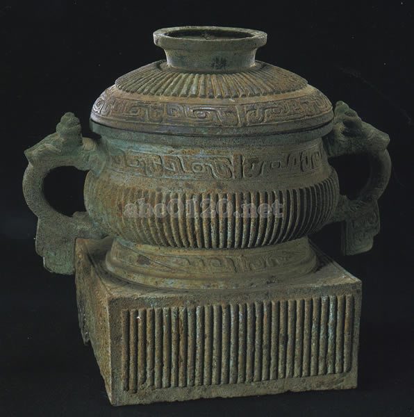 蓋には圏足形の鈕がつく.外彎した口縁.腹はややふくらみ,両側に獣首のついた取っ手がある 圏足の下は方形座.蓋の中部,器の腹部,座の四面に縦の線条文が飾られ,蓋の端部,器の頭部・圏足に窃曲文 蓋の内面中部に「魚」の銘がある。出所:「黄河文明展」
