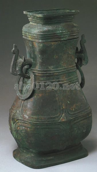 両耳は象首が環をくわえる形に作る 象の鼻は上向きに巻いている.腹に十字帯文.3行13字の銘文がある.器の銘は口の内側にあり,蓋の銘は口の外側にある。出所:「黄河文明展」