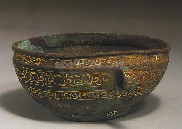 楕円形,圏足.腹部に対称的に環耳がある.頸と圏足に金象嵌の斜角雲文,腹部に金象嵌の蟠夔文帯が2周する。文様は美しく,金象嵌は細かい。出所:「黄河文明展」