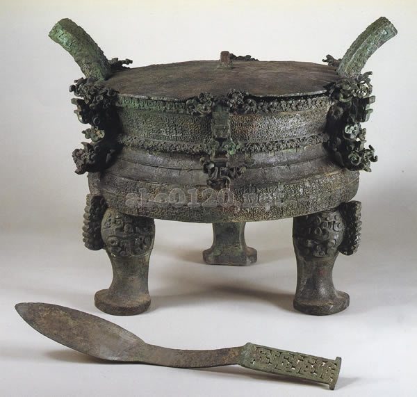 史料から推断すると,王子午は楚の荘王の子で,楚の共王の時に司馬の職となり,呉に対する庸浦(楚の地,今の安徽省無為県西南)の戦いに参加し,大いに呉軍を破った(前560年).楚の康王2年に今尹(楚の宰相)となり,康王6年,軍を率いて鄭国を伐ったが,功なくして還った.康王8年(前552年)夏に歿した,(王子午は『左伝』襄公12~21年に見える公子午,字は子庚のこと )蓋の上に置かれていた匕(さじ)は幾らか弧形をなし,撹拌に使われた。出所:「黄河文明展」