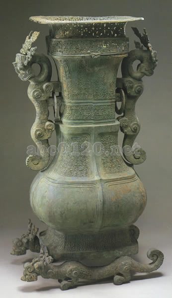 方形の口はやや広がる。長頸,下がくれの腹.透かし彫りの蓋は冠状で口が広がる.首を振り向けた龍形の耳が両側に対称的にあり,足も龍形で,圏足を背負っている 腹部に「干」字形の突帯,頭部・腹上部・圏足に窃曲文を飾る。全体の器形は美しく,龍の耳,龍の足と器身とは渾然一体となり,鋳造は細かく,文様は工夫をこらし,豪華な感じを与える。出所:「黄河文明展」