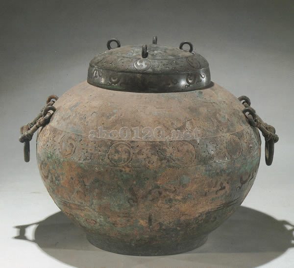 環形の鉦(つまみ),丸味のある蓋,直頸,広い肩,鼓腹,平底.短い圏足がある。肩に対称的に獣頭の環耳がある.蓋・肩・腹に龍文,雲文などを銅を用いて象嵌する。蓋の内側の口縁部に銘文が一めぐりする。形は均斉がとれ,図案は精細である。象嵌技術は特に秀で, とりわけ跳躍する龍の姿態は生き生きとしている。出所:「黄河文明展」