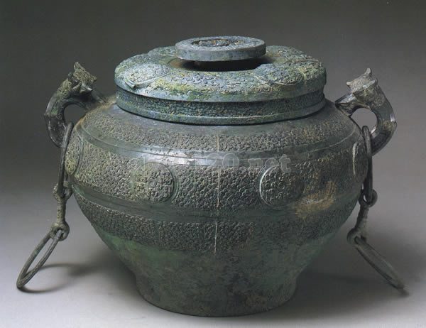 圏足形の銀(つまみ).円い蓋.角ばった口縁 短い頸.円い肩。肩に獣形の耳が一対, 2つつながった環をくわえる 。円い腹は下でひきしまる。平底.蓋の上・腹部に円堆文・蟠螭文および羽状文を飾る。口縁に「右征尹」の3字銘がある.これはた国の銅器である.発見の地点から見て,楚国の貴族が泰山を祭った際の用器と思われる。重厚な造り,複雑な装飾で,美しく気品がある。出所:「黄河文明展」