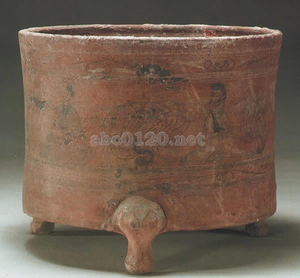 (酒つば) 前漢時代 口径21cm 高18.3cm 1980年河南省洛陽市出土 河南省洛陽市文物工作隊蔵 口縁部先端の断面は丸い.器壁は垂直に近い.平底.3本の獣形足.外壁に紅・黒・白の色で人物,樹木,雲気を描く。出所:「黄河文明展」