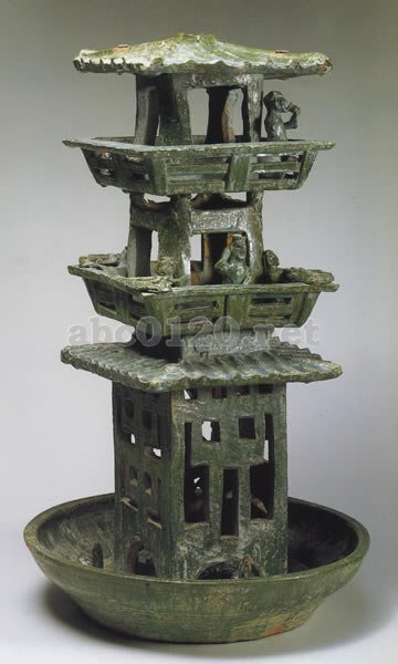 3層の楼、下は池で,中に家鴨・蛙・亀・魚などがいる。第1層の四壁に透かし孔があり,上に軒がある。第2層の四隅に弓に失をつがえる衛士と,指拝者が一人いる.3層目の一つの隅に小さな壺を持って水を飲む人がおり,別のに隅は横になった人がいる 上に寄棟の屋根があり,傾斜はゆるやかである.全体に緑釉を施す。出所:「黄河文明展」