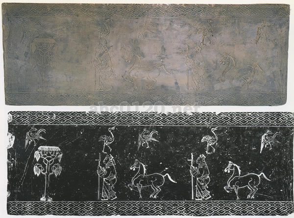 上下の縁に菱形文帯.その間は2段に分かれ,上段は鶏,鳥の文様。下段は前部に樹木,後部に同じ文様2組。前に歩く男が高冠を戴き,長衣を着,両手で戟形器を持ち,腰に剣を佩びる。その後ろに馬が首を上げ口をあけている.図案は型押ししてある。その線は流陽,柔らかみの中にも強さがある.人物と馬の表情姿態は真に迫り, まことに画像塼中の逸品である。出所:「黄河文明展」