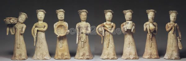 平たい髺に結い,後頭部に梳を挿す。長い裳を胸高につけ, 2本の帯が垂れている。大多数は緑衣に紅色の裳だが,中には褐衣または黄衣に緑の裳のものもいる みな手に日用品を持つ。布包・巾・物・瓶・壺・盤・熏・盆.これら侍婢俑は当時の生活を生き生きと表現している。出所:「黄河文明展」