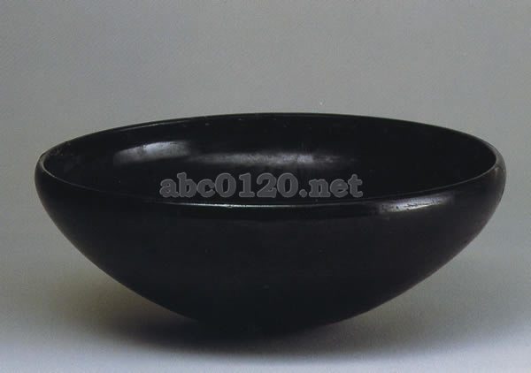 唐時代 口径19.2cm 高7.2cm 1984年河南省洛陽市龍門禅宗七祖荷沢神会墓出土 河南省洛陽市文物工作隊蔵 口縁部の先端は丸い。日はかすかにすぼまる.丸底.非常に軽い。陶製.表面に黒漆を塗り,顔が写るほど光っている。出所:「黄河文明展」
