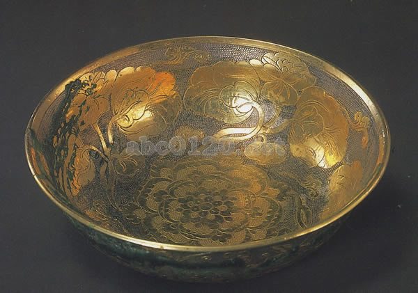 口縁はやや張り出し,腹は少し深い.円底.底内部に満開の花が1輸陰刻され,その周りは枝・蔓・花・葉である。花と葉は大きい.外底の真中にも満開の花一輸があり,周にも枝・蔓・花・業が陰刻されている.枝と蔓はしなやかで強く,花と葉は細かく小さく,ふくらんで今にも開こうとする蕾もある.さらに周壁に2羽の家鴨, 2羽の烏がおり,立って首を巡らしたり,飛び立とうとしたり,鳴いている様である.造形は生き生きとしている.文様の部分には金メッキを施し,魚子の地文がある。出所:「黄河文明展」
