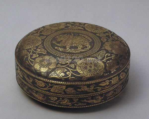 円形のふたもの。全面に文様があり,蓋は菱形・連珠文の帯で文様を内外の2区に分ける.中央は一角の神獣で, 口をあけ眼を剥き,流雲を踏み歩く姿.外側は花6輪と枝蔓の花草文が巡る.蓋の壁には飛翅する瑞鳥と花が巡る.器の側壁には走獣文と花草文.底面全体にも花草文を飾る。文様の一部に金メッキを施し,魚子の地文がある。出所:「黄河文明展」