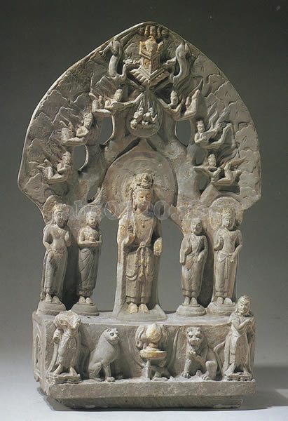 菩薩の立像を中心として,比丘と菩薩各1体が左右それぞれに立つ。それぞれ頭光をつける。中尊は宝冠を戴き,冠上に化仏を表わし,瓔珞をかけ,施無畏・与願の印相を結が.背後に菩提樹2株の作る透かしの身光がある。その頂部には舎利塔を中心に2匹の龍を配し,塔下に2体の飛天が物をささげ持つ。さらにその左右に3体1組の伎楽天の姿がある 方座の前面に力士と護法獅子各2が彫られ,真中は小力士が博山炉を捧げる.両側面には苦行比丘の龕がある。出所:「黄河文明展」
