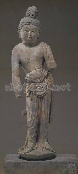腰を左にひねり, 両足先を少し開いて蓮肉上に立つ.蓮肉の下に枘がある。左右の腕は途中から失なわれている.肩に天衣をかけるが,上半身はほとんど肌を露わし,下に長い裙をつける.裙の上に金箔が残っている。顔立ちはふくよかで, いかにも和やかである.体に密着した裙は絹織物の柔らかさを表現するとともに,その下の肉体の線も示している.特に左右の腕が失なわれたために一層たおやかに見える.高い芸術性を具えた作品である。出所:「黄河文明展」