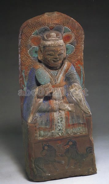 蓮花と火焔をあしらう身光を背にした道教像.道士の冠をかぶり,長衣を着て,腰帯をしめる。右手に麈尾を持ち,安坐する.台座は方形で,正面に足を上げて戯れあう2匹の獣,その問に博山炉がある.残りの3面に願文が刻まれる。年紀は「開皇三年」(583年)とあり,あわせて願文とこの造像を刻した人の名を記する.全体に紅・白・藍・緑・黒の色を塗る.色彩の鮮やかさは元のままである。出所:「黄河文明展」