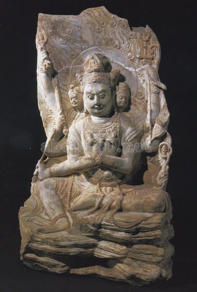 像は三面八臂.髪を上に高く束ね,その正面に化仏を表わす。上半身は裸形でやや左を向き.右上手は金剛杵を高く上げ,右中手は宝剣,右下手は矢を持つ.左上手は三叉戦戟を持ち,左中手は失なわれ,左下手は羂索を持つ.第一手は胸前で交差し,小指をからませて金剛印を結ぶ.胸飾りをつけ,瓔珞は面肩から腹, さらに左足と岩座の上に垂れる.腰に裙を着け,天衣は頭の面側から腋に巻きつき,岩座まで垂れる.足をくずして岩の上に坐る