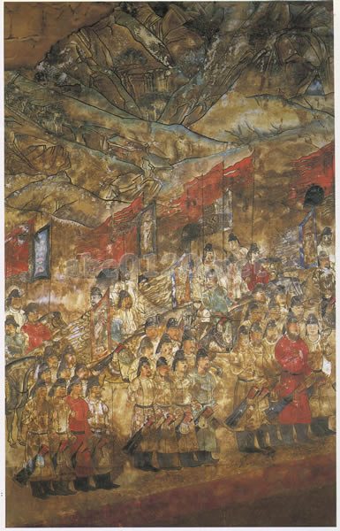 懿徳太子墓の壁画は計40幅.画幅は大きく,内容豊かで,色彩は華麗, さながら唐代の地下ギャラリーである.石青・石緑・石黄・銀朱・朱膘。大紅・深紅・金箔・紫砂などの鉱物顔料の使い方は熟練し,着色は西安や咸陽などの唐墓の壁画と比べて一層多様化している。出所:「黄河文明展」