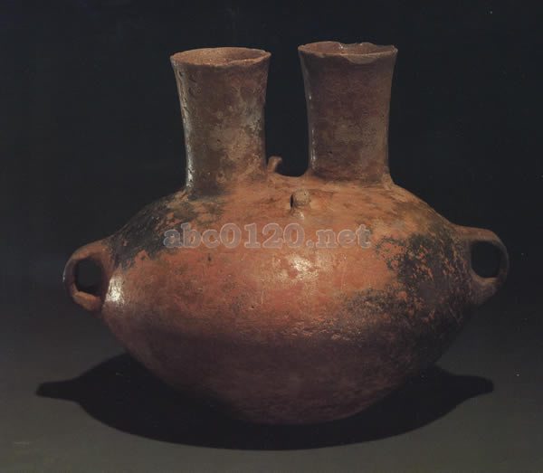 地は夾砂紅陶。器身は楕円形を呈し,ふたつの頚は直立した管状で,器腹とつらなり,ふたつの口はやや広がる。平底。腹部の両側に対称の孤形の耳がつき,肩部の両側に紐通しの銀がある。出所:中国内蒙古北方騎馬民族文物展