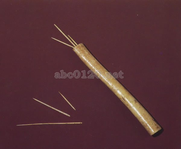 針筒は動物の四肢骨を切断し,加工して作つたもの。骨針は先が鋭く,頭は少し磨きをかけて平らにし,糸通しの孔が穿たれている。細工は大変細かい。出所:中国内蒙古北方騎馬民族文物展