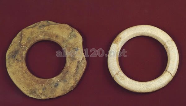 新石器時代 2点 大環:直径9, 内径4.5cm 小環:直径7.5, 内径5.2cm 1980年包頭市東郊阿善遺跡出土出所:中国内蒙古北方騎馬民族文物展 関連用語: