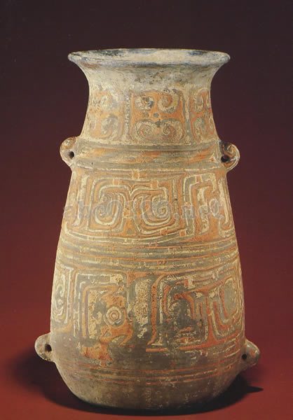 全体に紅色と白色の文様を施す。頚部に巻雲文,腹部に2組の変形獣面文, 2組の文様の間は竹節状弦文帯で飾られ, 2組の文様の上にそれぞれ3すじの弦文がある。出所:中国内蒙古北方騎馬民族文物展