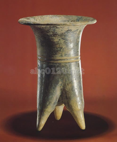 夏家店下層文化 高24.7, 口径16.5cm 1974年昭鳥達盟アオハン旗大甸子遺跡出土 ラッパ口,口唇部断面は円く,深い直腹。三足は中空で下は錐形を呈する。腹部に凹弦文2本があしらわれている。出所:中国内蒙古北方騎馬民族文物展 関連用語: