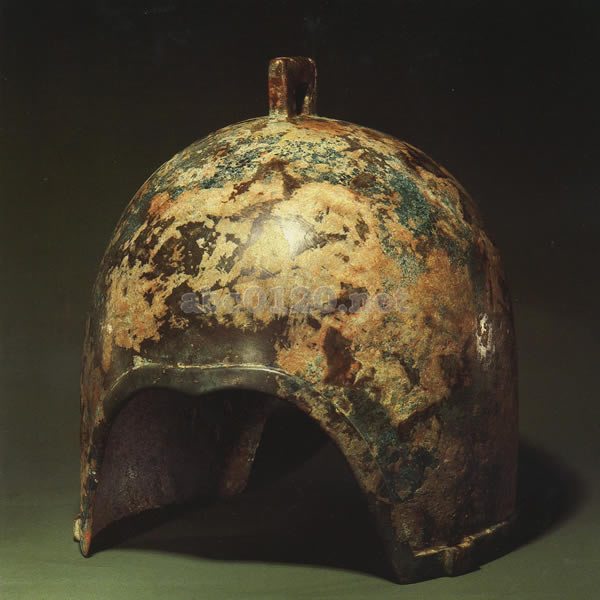 孔のあいた方形の鈕(つまみ)が頂に立ち,左右両面は下に垂れ,耳あてのかっこうになっている。前後は対称的に半円形に刳られ,その部分と耳あての下縁には1.2センチ幅の突帯が付く。両側の耳あての下縁にそれぞれ2個方形の孔のあいた鈕がある。頂上の鈕と両側の耳あて下縁の鈕は,皮ひもを通して頭に胄をくくりつけるためのもの。これは今まで発見された戦国時代最も精美な銅胄の一つ。出所:中国内蒙古北方騎馬民族文物展