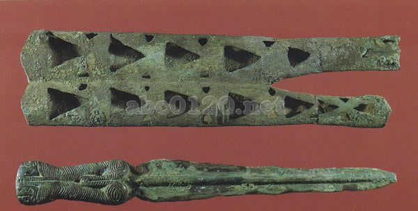 この剣と鞘は東胡民族独特の風格をそなえ, とりわけこの虎柄曲刃青銅短剣はめったに得られぬ珍品である。出所:中国内蒙古北方騎馬民族文物展