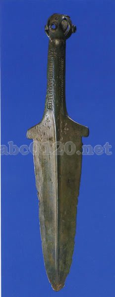 鈴形の柄頭、柄は断面楕円形で小方格文で飾られ,格は翼状を呈し,剣身は幅広で両刃にそりがなく,脊はまるく隆起する。形状は重厚である。出所:中国内蒙古北方騎馬民族文物展