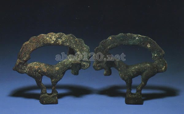 2点の形状は同じで,鹿の頭は下に曲がり,俯して見るさまをしている。臀部はややあがり,角と尾がつながって半円形になる。四足は内側にすぼまり,方形の銎の上に立つ。出所:中国内蒙古北方騎馬民族文物展