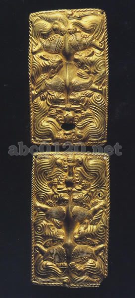 表は虎と牛の闘争の文様。中央の牛はひれ伏して,四肢を平らに伸ばしている。4頭の猛虎が2頭ずつ牛の頚部にくらいつく。牛は猛虎に捕まり殺されはしたが,なお頑強な反抗精神を発揮して,その鋭い角でもって虎の耳を突き刺している。造型は生き生きとしてリアルである。飾板の周辺は縄索文。四隅に円形の孔があり,裏面両端にそれぞれ稜形の鈕がある。2点の飾板は造型,図案,文様が全く同一だが, 1点は牛の頭部に直径1センチの円い孔があいている。孔に磨耗の跡があるが,帯鈎でこすれたものかもしれない。出所:中国内蒙古北方騎馬民族文物展