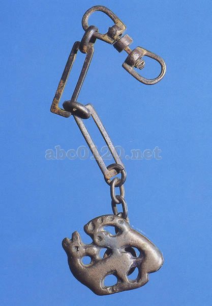 漢 鎖こみ長16.3cm 内蒙古フフホト市収集 鹿は雌雄。雄鹿に環状の角があり,造型が独特で,鎖をかける装飾となつている。出所:中国内蒙古北方騎馬民族文物展 関連用語: