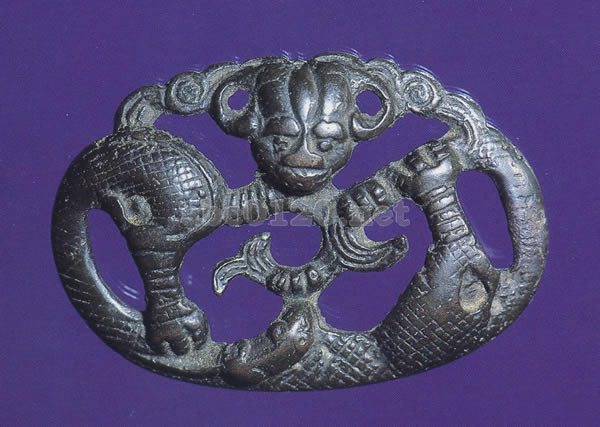 人面と楕円形に身をくねらせた龍とから構成されている。人面の眉鼻は広べったく,両眼は丸く見張り,口をあけて歯をむき出し,形象は貪欲凶悪である。龍頭の両側に一つずつ曲がった角,胴体に4本の足があり,全身に鱗があり,下部に鼠が1匹へばりついている。 出所:中国内蒙古北方騎馬民族文物展