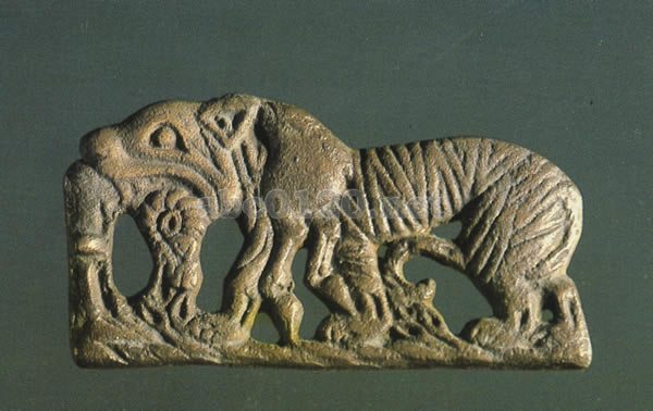 主体は縞模様の猛虎であり,角のある羊を口にくわえて,歩いているところのようである。虎の尾は後ろ足の間にはさみこまれ,尾の先は巻きあがって腹部に貼りついている。羊は首筋をかみつかれ,前の両足を虎の頭の前に垂らし,下半身はねじれて虎の首に掛かっている。弱肉強食の躍動感のある構図となっている。出所:中国内蒙古北方騎馬民族文物展