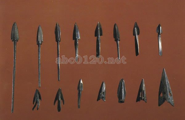 鏃には三翼形,双翼形,三稜形,四稜形,双翼双尾形など区別がある。一部の鏃の後部には鋋(なかご,やがらにさしこみつなげる部分)があり,鎚には長短があり,円形や扁形もあり,形はさまざまである。出所:中国内蒙古北方騎馬民族文物展